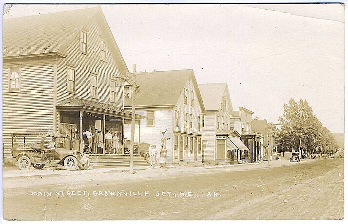 A group of folks gather on the front porch of what appears to be a general store and filling station in the centre of this quaint Maine community.