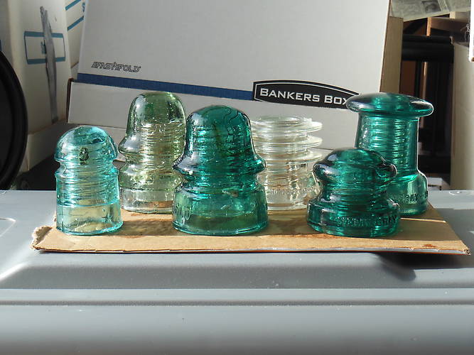 You really can't. Everything else is going to be a downer. Back row (left to right): yellow green California CD 161; odd clear Hemingray-110, CD 1071; and blue aqua Hemingray-25 door knob insulator, CD 175. Front row (left to right): aqua double star pony, CD 102, with a pinkie nail size silvery rock in the dome; dark aqua Brookfield, CD 162.1 with a cluster of fire brick rocks in the wire groove and some amber swirls; and a dark aqua Hemingray D-990, CD 137. |