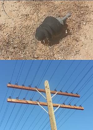 I found this composite while hiking along a stretch of what use to be an SP line, now UP. The funny part about this, the poles are long since gone! However, 30 miles down the road from where I found the single composite, I came across this pole full of 20 composites that appear to be still very much in service. Look at the next picture to see what else I came across while hiking along this line. |