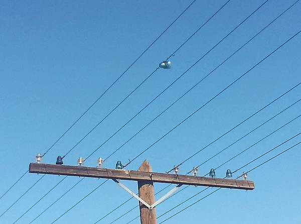 Over the years I have walked/hiked many a miles of tracks and this is the first time I have ever seen this. I have seen insulators that came off the pegs and hung there by the wire, but the distance from the cross arm to where this insulator is hanging in mid air is well over 6 feet! Where did all that slack come from, and better yet, where did it go? Obviously somewhere along the way, some linesman decided that they needed to have something on this pole, so the glasss was replaced by a composite, yet the glass was left to hang in the mid air. I don't think the linesman, unless he was about 8' tall could have reached this if he climbed the pole to put the composite into service. |