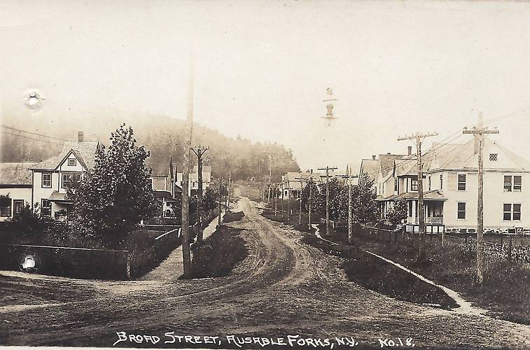 Most of these look like electric lighting circuits in this Ausable Forks, New York village. I am sure there are phone comms wires for local subscribers strung along this rather muddy road too, particularly along the left, most likely.