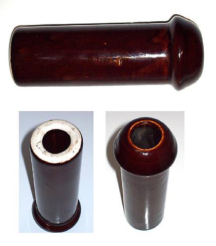I found this somewhat mottled brown glazed wall/floor tube in a bucket of miscellaneous porcelain (non-insulator) items at an antiques mall that was housed in an old converted chicken barn on the way to Bar Harbor yesterday. The tube is about 7-1/8" long, and the unglazed end has an outer diameter of about 2-1/8". The inside is uniform for the whole length at about 1-1/8" inner diameter. I searched the Picture Poster gallery, but couldn't find anything quite like it. It's virtually mint. Are these uncommon? |