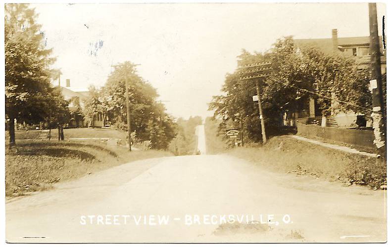 A good looking ten-pin, three-crossarm telephone open wire lead with some of its glass insulators glimmering in the sunlight is seen along the right. It also had a public telephone sign affixed to it for customers of the store or establishment (with their ground-level sign) in the background. On the left is what looks like a pole line supporting electric utility wires along this dusty road in Ohio. |