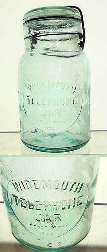 Quart sized fruit jar made by the Whitney Glass Works circa 1890's-1900, very light aqua and front embossed: The Wide Mouth Telephone Jar trade mark reg / C2. Has it's original neck wire and bail, the lid AND also a very old rubber seal. Mint condition. $34 + ship. |