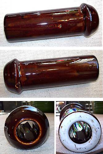 Here is a large, somewhat mottled brown glazed porcelain wall tube marked THOMAS-U (I think it's a U). I am told these were used in a building to carry high voltage conductor and that it was likely a wooden wall since the tube is too short for a brick wall. It measures 7-1/8" long; the unglazed end has an outer diameter of 2-1/8"; and the inner diameter is uniform for the whole length at 1-1/8". I searched the Picture Poster gallery, but couldn't find anything quite like it. It's virtually mint and can be yours for $25 plus shipping. Thanks for looking. |