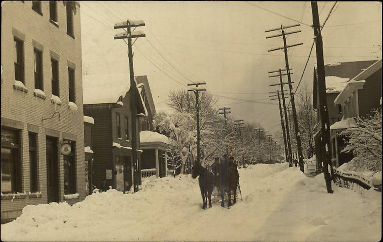 Local electric lighting distribution circuits were strung along the left (gotta love the snow build-up upon the crossarms almost completely covering their insulators) with a telephone open wire route along the right side of this snowy Pennyslvania village's thorofare. The local Bell Telephone company apparently had ops here or a public phone available as noted by the sign in front of the building on the left. |