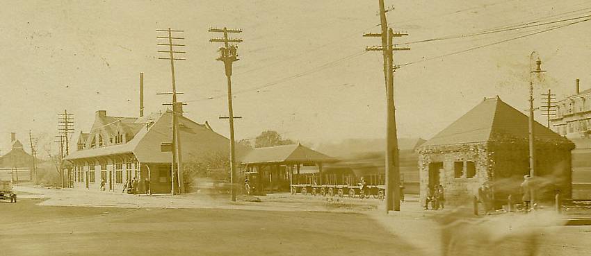 The latter was the old 6-pin tall pole line seen on the left. This main line communications line between Boston and Albany, NY (with circuits expanding elsewhere) was rebuilt soon after this picture was taken utilizing 10-pin crossarms and hard-core solid copper wire (superceding the former iron wires). Sections of the early teens upgrade stood until the 1980s from Boston to Albany along this RR route. |