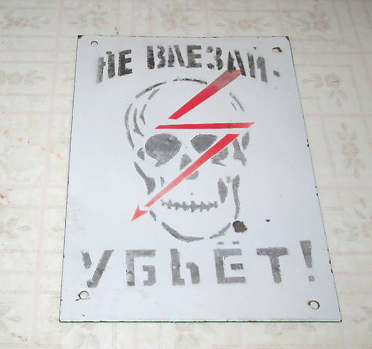 Great early Russian "Danger High Voltage" porcelain sign. It measures approximately 11 inches tall by 8 ½ inches wide. I have no idea what the translation is, but definitely a cool piece because of the skull! The front looks to be in great shape with only light scratching and general wear. There is one small chip on the front of the sign that is about ½ the size of a dime. The edges show some roughness and light flakes. There are four holes in the corners of the sign for easy display. The reverse of the sign is quite crudely made. There are quite a few bubbles on the reverse as well as some moderate surface rust in a few places. $75 plus shipping. |