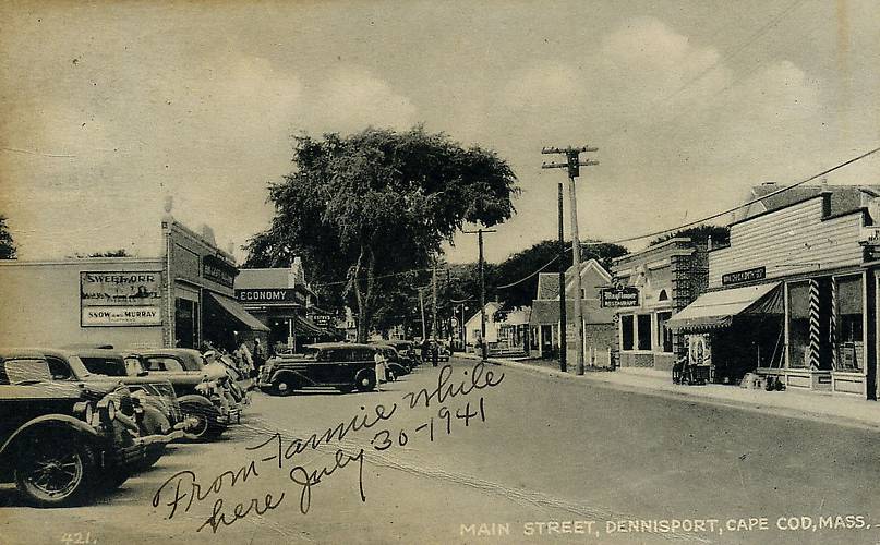 Nice pre-WW2 image of this popular seashore vacation community with some cool Americana within view and electric utility lines owned by the former Cape & Vineyard Electric Company.