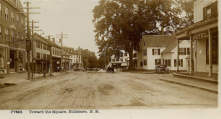 Quite likely the two-pin crossarm atop the taller pole on the left carried fire alarm telegraph circuits. Typically through the teens these circuits were strung along pole tops since they were vital for immediately reporting fires, therefore it was desired that no other wires come in contact with (fall upon) them. Immediately beneath were telephone wires for local customers, combined to paired cable via a wooden box on the same pole. A local operators' office might have been nearby connecting it to the openwire via the forementioned heavy cable. Electric lighting service wires also ran along this New Hampshire community's downtown. They were strung along separate poles (typically for keeping their higher voltage wires at a safe distance from the comms ones) and one of these has an old gooseneck incandescent street light upon it. A nice Bell Telephone sign appears in front of the hotel on the right. |