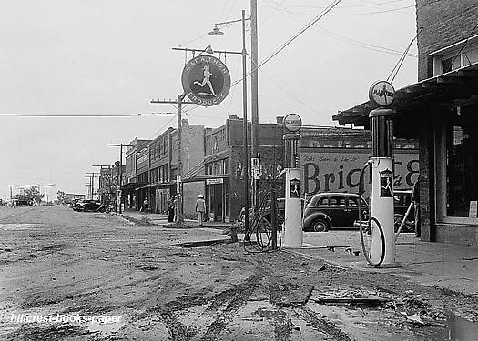 Caddo, OK 1938, Radial Wave Street Light, Old Gas Station, Cars
