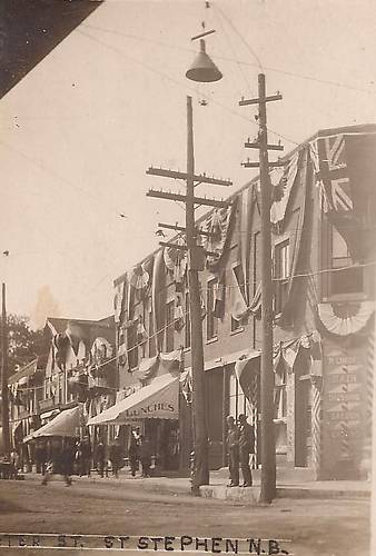 The latter were among the very first electrically operated street lights. A large metal, conically-shaped metal shroud protected the electric arc from rain, snow and other inclement weather. Also seen are a variety of electric and telephone open wire lines that served local subscribers in this New Brunswick community. |