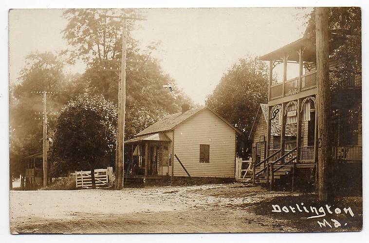 Individual, lightly-colored glass insulators prominently stand out in the sunlight upon their crossarms along this route though this Maryland village.