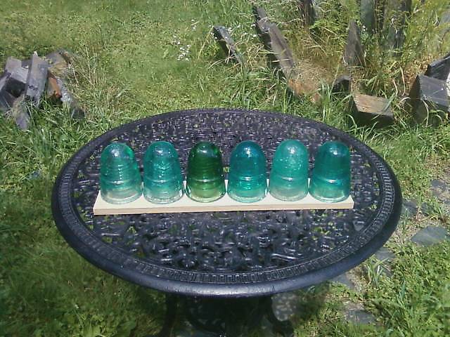 Found these on way back from my first show (Dec 2013 Polecat's) 3$ ea? sure, I'll take 'em all! Left to right: 1).American Insulator Co.[020] in some type of aqua with and or (or not) blue and or (or not) green, 2). [020] in a slightly darker aqua with and or (or not) blue and or (or not) green, 3). [020] (looks green to me) in a greener shade of aqua with and or (or not) blue and or (or not) green,4). No Embosing [030] (I believe)- ground looking base, in aqua with and or (or not) blue and or (or not) green of a bluer tone with bubbles,5). [020] in a lighter bubbly aqua with and or (or not) blue and or (or not) green, 6). [020] in a slightly darker shade of aqua with and or (or not) blue and or (or not) green with a light milk 'snotter-falls over threads. I welcome color opinions! |