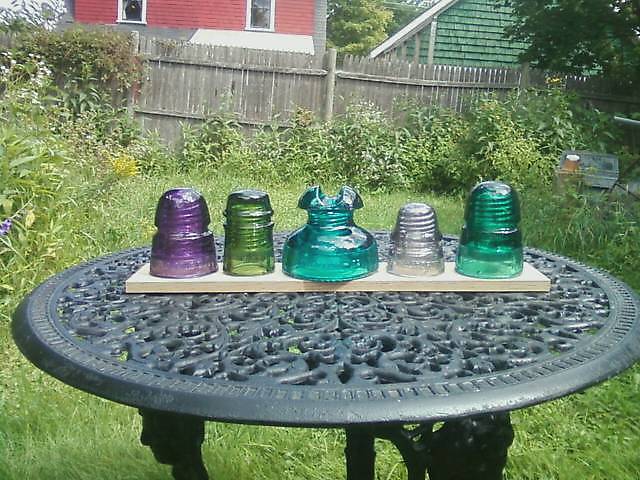 L to R: 145 B.G.M. CO. [010] in purple last year antique show,- what's better than shopping with your dog?, 2. B.T.Co. of Canada 121 [040] in ( I've been told) yellow green same show. 3. Hemingray 295 [010] in : nice color!, Hey, I like it! this year, same show, 4. California 160 [010] in light smoky purple-ish aqua with and or (or not) blue and or (or not) green, A Dollar Fifty? 5. Just a plain old 145 B in a color I like (aqua with and or (or not) blue and or (or not) green) |