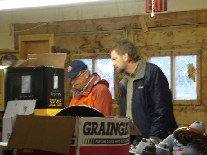 Gary and Jay look at the used liquor boxes that were available at the Extravaganza.
