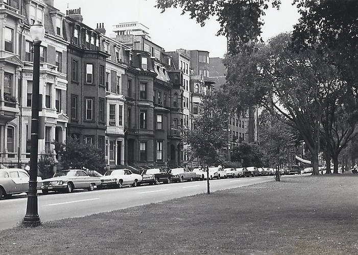 These were common throughout the city since the 1920s and a few still may be in service today scattered around Boston. These employed a 120V multiple 860-watt (15,000 lumen) or a 620-watt (10,000 lumen) clear lightbulb specially designed for street lighting service. In their earliest days these lights operated in multiple strings and not street series, During the early 1960s a lot of them were converted to individual photoelectric lighting controls with their bracket right below the base of the globe as you can faintly see here. The globes originally were glass. In later years plastic ones were used as replacements. Lightweight spun-alunimum "toppers" were used a lot too, as seen. Some of these globes (especially the later UV-resistant plastic globes from the 1980s) were outstanding replications of the originals and did not yellow or fade making it difficult for a well-seasoned vintage street lighting enthusiast (like me lol) hard to tell from the ground if the globe was plastic or glass, albeit only about 12 feet up from my good eyesight ;-) The fine brick residential buildings from the turn-of-the-century in the background still stand and have been kept in prestine condition. PS...That's the top of the then-new Prudential Insurance Company building peeking its top level in the background. ======================== |