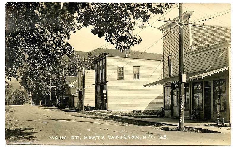 Local telephone subscriber circuits appear to have been strung above this old street lamp....the latter mounted on an unusually long pipe-bracket. In addition, electric lighting lines most likely were atop the uppermost portion of this pole line that once graced this New York State village. |