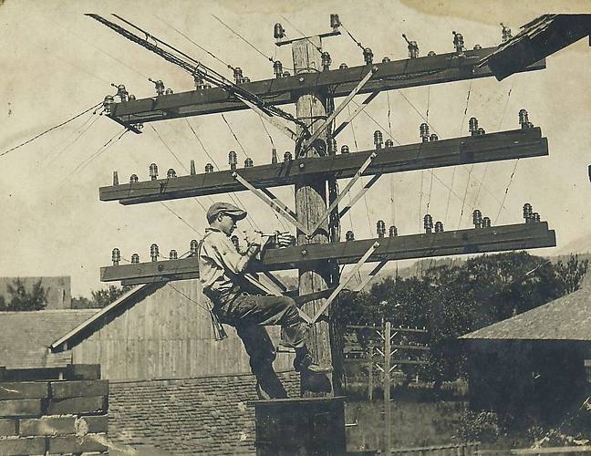 Telephone Lineman Working Upon Openwire Pole, c.1910.