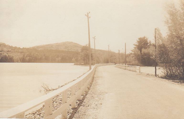 The "bow-and-arrow" nickname was for this style of heavy-duty steel brackets used for single-circuit, three phase electric lines. Some still are in service here in the USA. However (very unfortunately) this type of good-looking construction has been pretty much obsolete for the last few decades. What looks like a telephone openwire route employing a couple wooden sidepin brackets is seen along the right. |