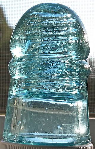 Here's a cool blue early Brookfield glass insulator. Has some attractive blue tones similar to some McLaughlin insulators. One base opened bubble and approx 1 inch shallow base sliver chip. One inch milk swirl in the skirt. First email gets this beauty for only $15 plus postage. Thanks! |