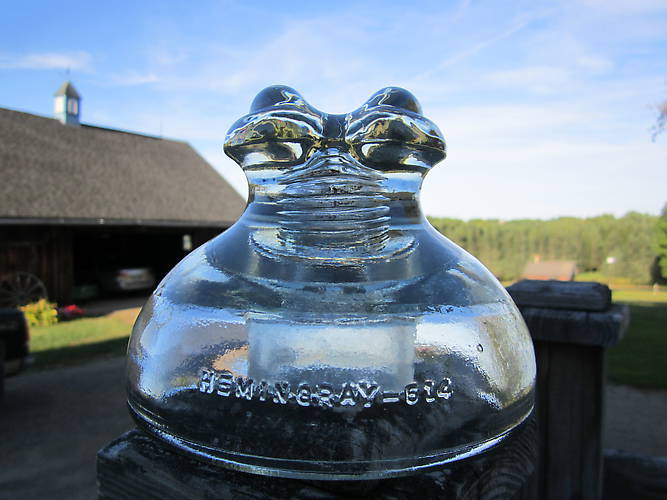 Here is a VVVNM Hemingray 514. It only has a small what seems to be open bubble on the inner skirt, and a very tiny prick on the front skirt. This can be yours for 5.00+about 10.00 shipping. I think this would look very nice perched up on a display pole! |