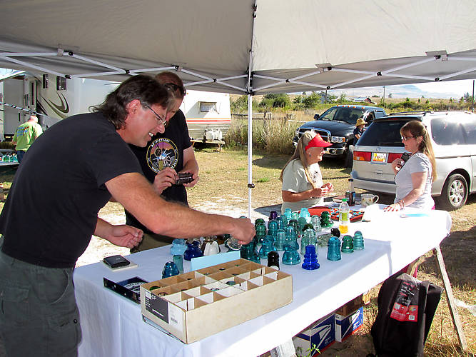 There's always a crowd hanging around Tom & Linda Katonak's table, and both Ryan & Russ Paton appear to have found something of interest. I know Tom found at least two full boxes of glass to take back home to New Mexico, and Linda (a birder) spotted a species of woodpecker that she hadn't seen in twenty years |