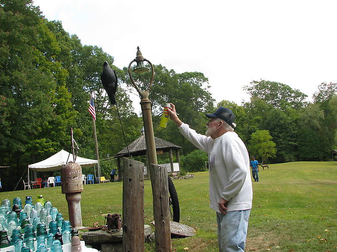 Larry spraying hornets that made a nest in the plastic crow decoy.