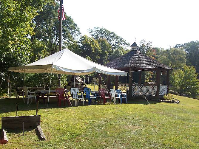 The gazebo (built with old power poles) and the lunch tent. Larry and his wife put on quite a spread!