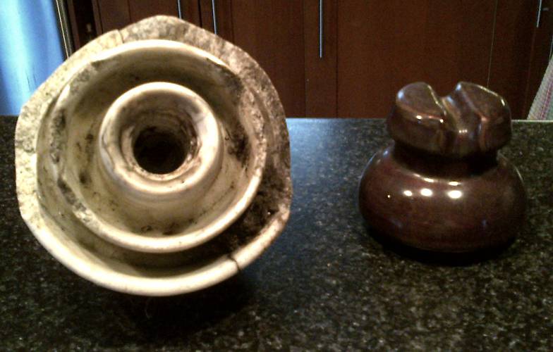 Here is the belly of the beast. The 2 inner skirts are in the best condition I have found to date. Originally I thought these were used on the same line as I had been finding the U-913a's (previously unlisted), but the time periods do not match as the 913a's are likely 20 years newer. So now with my previous theory thrown out, it is quite possible I may have some new places to look for more Boch's. Will I ever find a whole one? Probably not :) Our harsh Ottawa winters and severe freeze-thaw cycles cannot be kind to these very fragile dry-process insulators. For anyone who has never found one of these, they weigh a TON and are not fun to carry around through the dense jungle of brush and vines where I have found them all! |