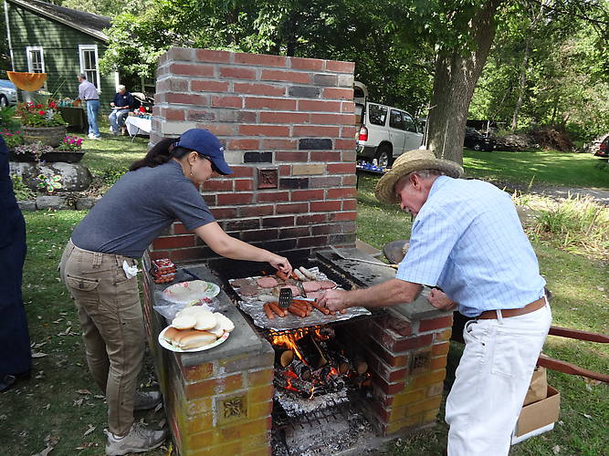 Claude cooking at the outdoor fireplace.