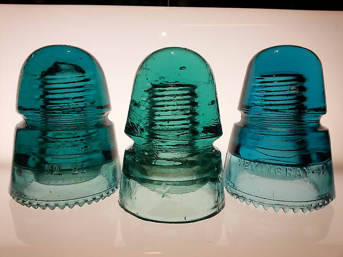 Three very nice CD 145 beehives. LEFT - Hemingray No 21 in a nice blue with sharp drip points. CENTER - a Postal style Star in medium aqua. RIGHT - a Hemingray-21 "Tee Pee" style beehive in a very deep blue. All three are very close to mint condition - including the drip points! Asking $20.00 plus shipping for all three. SALE - NOW $15.00 plus shipping! Thanks for looking! |