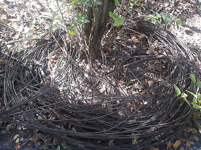 I've been hunting an old line after a tip from a guy who tore out the final iteration of the line in the 1960s. I was surprised to find neatly wrapped coils of iron wire in the underbrush, carefully laid down as though it was going to be reused later. |
