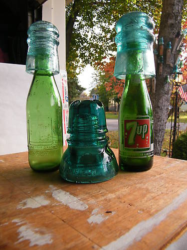 Its easy to see the 102 and 126 crebs are not 7 Up green in this pic. Purchased my first two 7 Up bottles even though I've seen them for sale often in antique shops. Never really considered them to be antiques. If I were to think so then I'de have to consider myself one as well. Anyhow, at the time of said purchase I didn't think I was also buying flash backs to the early 1960's which was actually my first glass gathering experience. Walking on memory lane I was reminded how a 1 or 5 cent deposit bottle found was worth either a one cent candy or a 5 cent popcicle or candy bar. Any of you folks out there share my experience? The glass raised embossed 7 Up bottle was purchased along with the 126 creb. Seldom do I buy any insulators or anything at that indoor fleamarket even though I frequent often. The CD 208 Brookfield was found at another location where I once found a CD 149 Brookfield mixed in with a bunch of common not desirable insulators. I didn't expect I would find another however I was much surprised that the 208 was waiting for me. Even if it isn't in mint condition it will look great on my outside display that is located right outside my front door. The 102 creb was an adventure all by itself and tells the length I will go to find insulator. This adventure started on the eastern shore of the Hudson River. Anotherwords I crossed over it not being satisfied by my previous mentioned finds above. I do go over to the City of Hudson a couple times a year to see if any of the numerous antique shops have collected me any. On this day no sooner then I exited my car the hunt was one. By this I mean I called over a chainlink fence and asked a gentleman if he had and glass wire inslators. Apparently he was taking advantage of the parking lots earlier farmers market being right acroos that parking lots alley with was deided by that fence. Anyway his answer was yes he had some but they were at a different location. Said he would go get them if I was interwested. Of course I was so I talk him I would come back after walking up and down Warren Street where all the antique shops are located. After about an hour of walking that street I returned empty handed to the parking lot. My contact was also entering the parking lot from from a different entance. Then I was told he didn't get them. From there I offered to accept his offer for me to drive to where the insulators were stored. That was done and soon a 5 gallon bucket was in the back of the passenger's seat awauting their viewing when we return to where the gentleman was selling his wares in the alley. No sooner then we were back there the dark clouds in the sky let loose and I ended up looking at all the commons in the yellow bucket. The creb was the only insulator I purchased. Cost me $1 for all the seed bubbles and rear skirt crack. Still I think the seller made out better then I did. Especially being from there I gave him another ride to where he resided. That would have cost him at least $5 just to open a taxi door. Hope you've enjoyed joining me in my hunt. Till the next time ood luck with your own hunts. I know many of you will be in Springfield soon to find some gems. Can't be there on Halloween myself being I must give away candy. But I'm seriously thinking of driving through the night so I can be there on Saturday at 9AM. Can't stand the idea of not endulging in the candy that will be there!! |