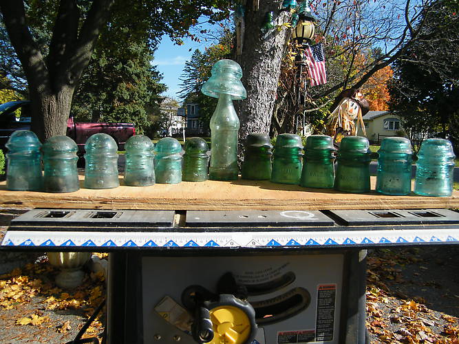 My favorites in this bunch are the four Brookfield CD 121's with blotouts on the rear skirts. They are to the right of the Coca Cola bottle. Three are green and the remaining is yellow green. It was only by chance that I found the bottle. Some one had but other bottles on a box of insulators and as I was moving them back to a bottle box I noticed the Star on the Coke bottle. Just had to take it. I will be posting some questions in the questions/ asked photo gallery about this bottle in general as related to unsulators. If you have any answers feel free to email me. Thanks. |