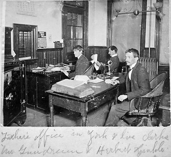 1897 shot of a CNWR office. Great early phone and a relay on the desk in the foreground, but isn't that a CD 127 WU Brookfield on the desk against the wall? Probably an insulator working as a paperweight to keep all the those documents on the desk since its right next to the door. |