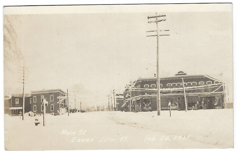 Photo taken on February 26, 1915 during an ice-snow storm in this quaint Vermont village. Railroad tracks crossed this roadway (intersecting about in the centre of this image) with a six-crossarm telegraph line pararelling it.