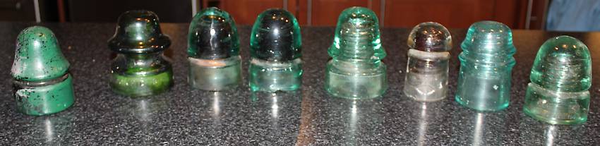 Saw an ad for insulators on Kijiji and really didn't bother to look at it until another collector brought it to my attention. The lady who posted the ad said there were close to 200 in many shapes and colours. An hour and a half drive got me there, but I honestly didn't have my hopes up. The antique store was a former dance hall/theatre in a small rural hamlet. Outside nothing spectacular, but the interior was completely tin-clad with a cool embossed pattern. Anyhoo, a lookie loo through the glass, and I brought these 8 home. pay special attention to the one on the far left. It is a NECAN RB CD 133 covered in paint... |