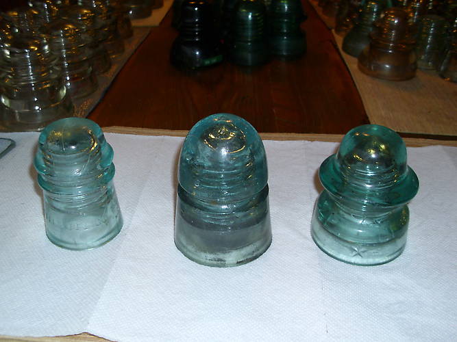 Three singletons. Left to Right, "Am Tel & Tel Co" CD 121, "Am Insulator Co NY" plus patents embossed on bottom of skirt, A Star