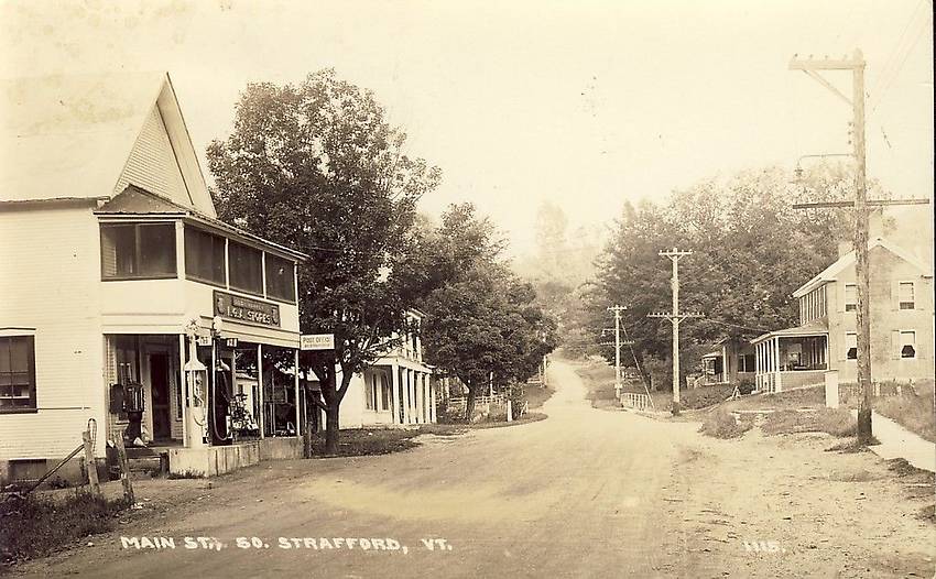 Electricity was provided to customers in this small Vermont community via the electric distribution lines atop this pole line. A ten-pin crossarm route beneath connected area telephone subscribers. Note the cool general store on the left with the interesting and old gas pump in front of it ;-) |