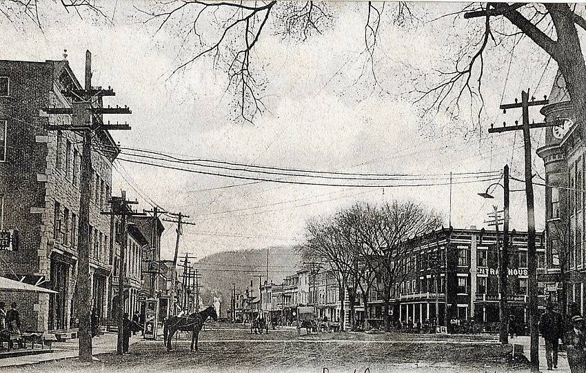 Comms wires and cables along with electric lighting circuits are seen criss-crosseing this New York State community's business district. In the foreground on the left is a tall telephone openwire pole with a wooden junction box. Open wire phone circuits were combined within it for the paired cables seen crossing the street. Those cables very well might have led to the town's central telephone office switchboard within the building on the rar right. Also on the right (foreground) is an electric lighting service distribution pole with an incandescent gooseneck street light upon it. |