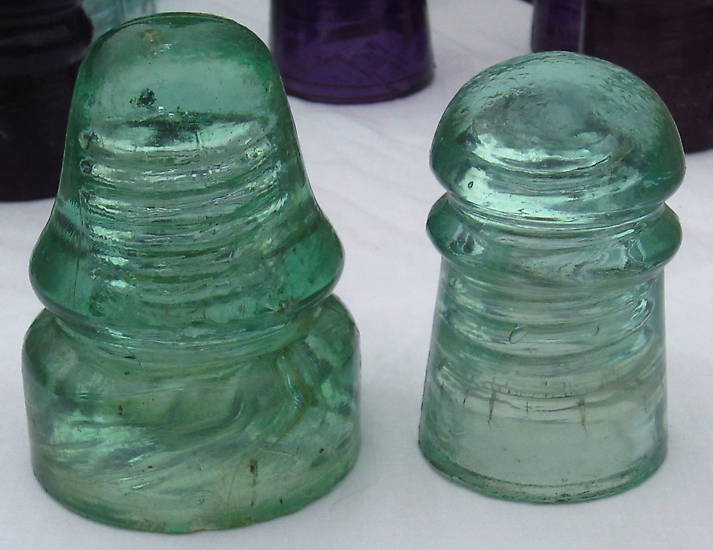 And then the insulators start coming out. Hmm... some older glass. MLOD unembossed Canadian CD 102 and CD 133, both light green. Not too bad! Everything inside is laying in the time capsule on its side, piled on thin layers of newspaper between layers, but with nothing protecting the insulators from those next to them! Amazingly, nothing seems to be broken. As you [id=425249687;continue to pull insulators out], the excitement grows! |