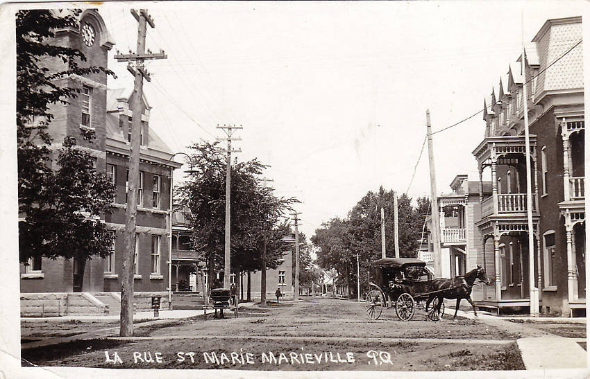 Along the right is covered paired telephone cable that very likely replaced at least three crossarm's worth of 10-pin openwire in this Quebec community a century ago. This is evident by the three pole "gains" or crossarm notches also seen on the pole on the right. |