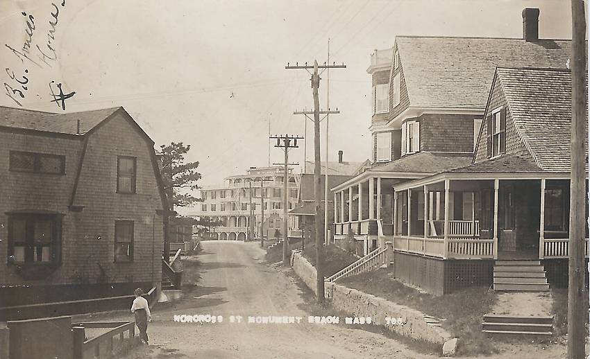 Older homes in the foreground and a large hotel in the background most likely were electric lighting customers in this small seashore town. Also note the distribution transformers. They stepped down either 2,200 or 1,100 volt primary to 110 volts secondary. |