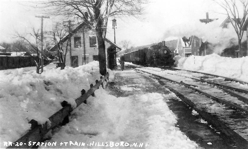 The latter was strung along the left leading to the telegrapher's office in the background with a locomotive approaching this New Hampshire community's railroad depot.