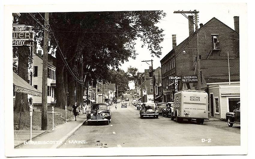 Cool postwar image of a stretch of the main street in the heart of the business community serving the residents of this Down East community.