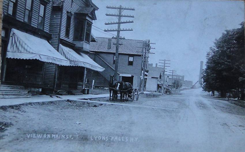 Telephone openwire likely was the rule along this three to four-crossarm, ten-pin lead (albeit with tilted arms;-) along the centre of this New York state's village with electric distribution circuits beneath on the shorter arms supporting heavier cables. |