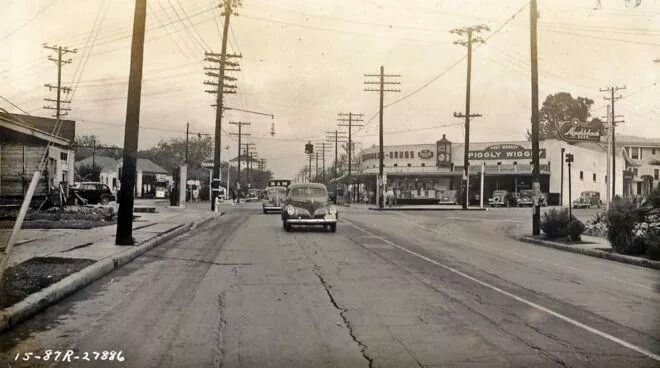 A vintage picture of Fredricksburg Road in San Antonio, Tx, showing old poles and streetlights. Gee, I remember Piggly Wiggly! My mom used to drag me there on Friday mornings for groceries.