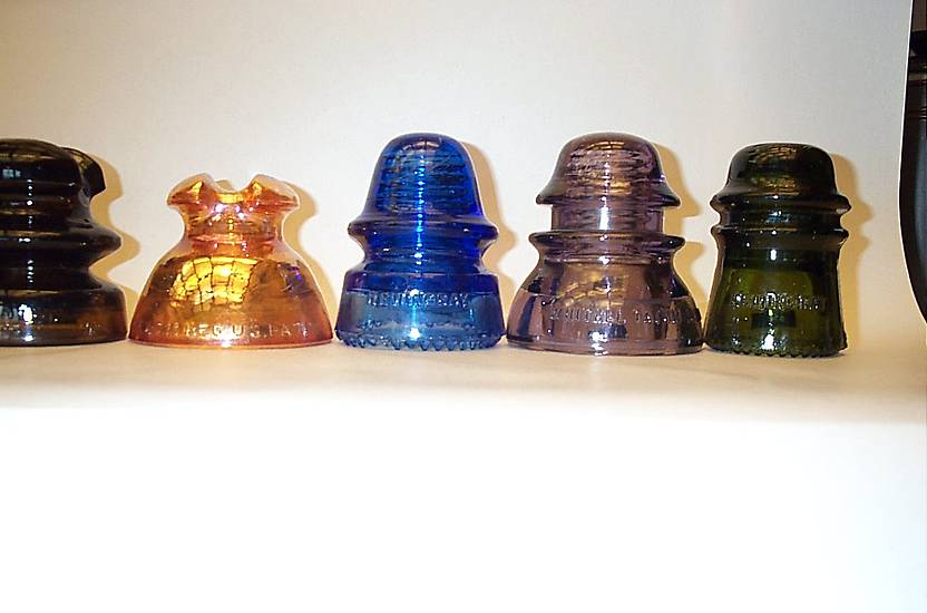 These insulators show just what was out there in the mid 60's to early 70's. I collected all of these, some were in use and I replaced them with Hemingray-42's. The CD 162 Cobalt Blue Hemingray and CD 121 Olive Green Hemingray were on a x-arm that carried no wire. I collected three of the CD 234 Carnival's, one has a hole all the way through the skirt. Less interesting, and therefore not pictured were the following: CD 157 Hemingray in Aqua, CD 208 Hemingray in Aqua, and CD 210 Postal in Dark Aqua. Perhaps the oddest I ever found was a CD 257 Hemingray in Clear. It was stuck on a limb tied to a fence post. It had at one time supported a farmer built hoop and holler line. Pictured are: CD 219 Hemingray, CD 234 Pyrex, CD 162 Hemingray, CD 154 Whitall Tatum, and CD 121 Hemingray. |