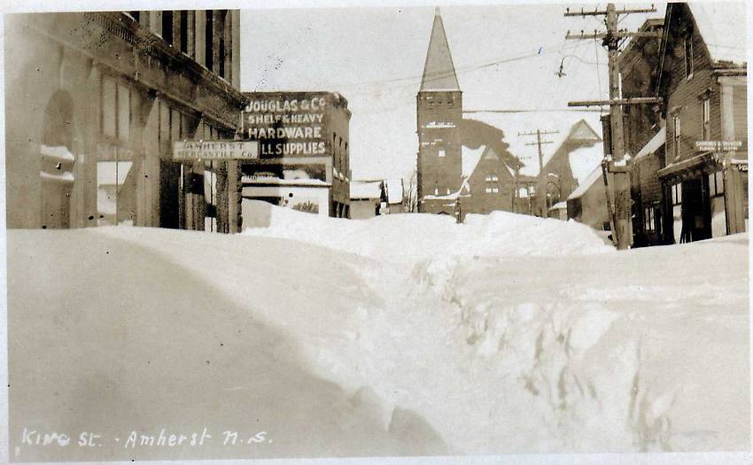 Looks like the snow we see with our southeast Massachusetts storms! Electric service lines are viewed along the right in this Nova Scotia community. I bet that old gooseneck-style incandescent street light beautifully and romantically illuminated the surrounding snow by its crisp white light ;-) |